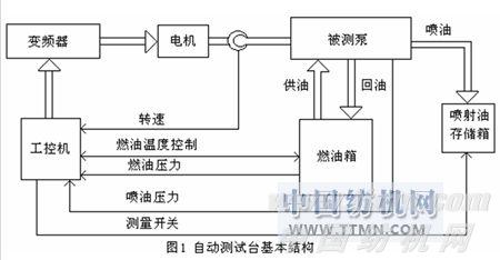內(nèi)燃機(jī)噴油泵自動測試臺主要由異步電機(jī)驅(qū)動裝置、燃油油路及調(diào)節(jié)裝置、噴油存儲及測量裝置和計(jì)算機(jī)測控裝置等幾大部分組成。整個測試系統(tǒng)的基本結(jié)構(gòu)如圖1所示。