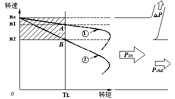 如上圖所示,①、②號曲線分別為線繞式電機(jī)轉(zhuǎn)子回路串入電阻前、后的機(jī)械特性曲線。圖中陰影部分表明電機(jī)在串入調(diào)速電阻后,其功率損失增大許多,且機(jī)械特性偏“軟”,電機(jī)驅(qū)動能力明顯下降。