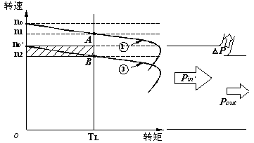 因轉(zhuǎn)差變大,機(jī)械特性變“軟”,在負(fù)載轉(zhuǎn)矩TL不變的情況下,拖動系統(tǒng)的工作點(diǎn)由A點(diǎn)移到B點(diǎn),轉(zhuǎn)速由n1降為n2。其定子電磁輸入功率分配情況如下: