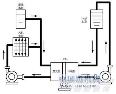該部分由冷卻泵、冷卻水管道、冷卻水塔及冷凝器等組成。冷凍水循環(huán)系統(tǒng)進(jìn)行室內(nèi)熱交換的同時,必將帶走室內(nèi)大量的熱能。該熱能通過主機(jī)內(nèi)的冷媒傳遞給冷卻水,使冷卻水溫度升高。冷卻泵將升溫后的冷卻水壓入冷卻水塔(出水),使之與大氣進(jìn)行熱交換,降低溫度后再送回主機(jī)冷凝器(回水)。