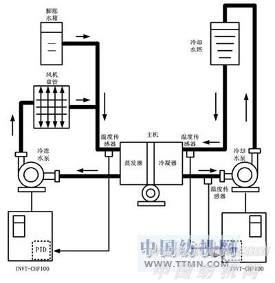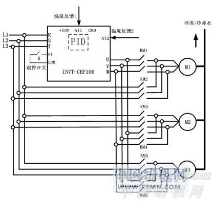 分別在主機(jī)蒸發(fā)器回水處、冷凝器出水及回水處安裝溫度傳感器,實時檢測管網(wǎng)的溫度,以模擬信號(0~10V或者4~20mA)反饋給變頻器,通過變頻器內(nèi)置的PID運算輸出相應(yīng)的頻率指令后自動調(diào)節(jié)水泵轉(zhuǎn)速,從而調(diào)節(jié)各循環(huán)水的熱交換速度,最終實現(xiàn)對室內(nèi)恒溫度的控制。需要特別說明的是,變頻器內(nèi)部在設(shè)計上集成了溫差反饋處理功能,系統(tǒng)無須另配專用控制模塊。