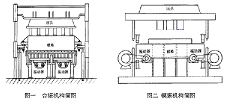 按振動(dòng)源作用的位置不同,砌塊成型機(jī)可分為臺(tái)振機(jī)及模振機(jī)。振動(dòng)源直接作用于振動(dòng)臺(tái)的機(jī)型稱為臺(tái)振機(jī),型號(hào)以“QT”開頭。振動(dòng)源安裝在模箱上的機(jī)型稱為模振機(jī),型號(hào)以“QM”開頭。因臺(tái)振機(jī)具有產(chǎn)量大、砌塊平均損耗振動(dòng)功率小等優(yōu)點(diǎn),已成為國(guó)內(nèi)磚機(jī)廠家的主流機(jī)型。圖一、圖二分別為臺(tái)振及模振機(jī)構(gòu)簡(jiǎn)圖。以臺(tái)振機(jī)為例,一般振動(dòng)器是由電動(dòng)機(jī)或液壓馬達(dá)來驅(qū)動(dòng),通過振動(dòng)器中的兩根帶有偏心塊的軸產(chǎn)生相向的高速轉(zhuǎn)動(dòng),水平方向的離心力互相抵消、垂直方向的離心力互相疊加,從而產(chǎn)生垂直定向振動(dòng)。成型砌塊較少時(shí),模箱下可設(shè)一個(gè)振動(dòng)源;成型砌塊較多時(shí),可設(shè)兩個(gè)或多個(gè)振動(dòng)源。
