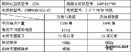 公司研發(fā)及技術(shù)人員經(jīng)多次現(xiàn)場(chǎng)調(diào)試,根據(jù)振動(dòng)系統(tǒng)的運(yùn)動(dòng)特性,在公司原有CHE系列矢量變頻器的基礎(chǔ)上作了相應(yīng)的軟件及硬件改進(jìn),從而開發(fā)出了CHE系列磚機(jī)專用變頻器。該系列變頻器最大的特點(diǎn)就是能夠在滿足振動(dòng)技術(shù)要求的前提下,省去制動(dòng)單元及制動(dòng)電阻。目前該系列磚機(jī)專用變頻器已成功應(yīng)用于泉州某工程機(jī)械有限公司,以下是該公司生產(chǎn)的砌塊成型機(jī),在使用了CHE系列專用變頻器進(jìn)行前后的生產(chǎn)數(shù)據(jù)對(duì)比:
