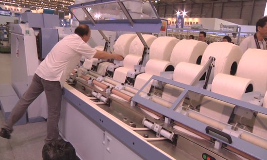 在此次展會上,這個CJ66型棉精梳機是我公司新推出的機型。我們現在可以看到的速度呢是450鉗次,鉗次就是每分鐘450轉。這個速度現在看起來其運轉還是相當的平穩(wěn)。從它的棉網來說非常的整齊,沒有我們所謂的破邊破網的情況。頂梳設計上我們還是延用了原來我們的自清潔頂梳。那么從產品的品質來說,該機在相應棉花條件下,精梳紗成紗質量可以確保在烏斯特公報的5%的水平。