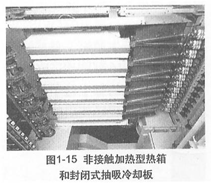 根據(jù)不同的加工用途,ATF—2l型高速拉伸變形機(jī)可選擇M形、V形或T形絲道的配置。特別是T形絲道的配置具有短而直的絲條通道,有利于高速高質(zhì)量的加工?,F(xiàn)將三種絲道的第一熱箱、冷卻板比較如下,見表1—33。T形絲道的非接觸加熱型熱箱和封閉式抽吸冷卻板見圖1-15。