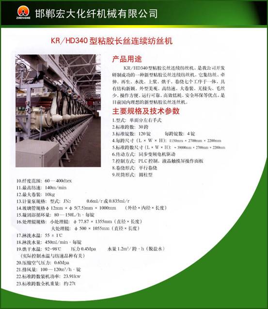鄭州紡機(jī)邯鄲宏大化纖機(jī)械有限公司展出KR/HD340型粘膠長(zhǎng)絲紡絲機(jī),這是該公司開發(fā)研制的一款新型粘膠長(zhǎng)絲連續(xù)紡絲機(jī)(見(jiàn)圖l-12),它集紡絲、牽伸、再生、水洗、上漿、烘干、卷繞等七個(gè)工序于一體,具有高紡速、大卷裝、無(wú)接頭、毛絲少、操作方便、運(yùn)行可靠、高效低耗、安全環(huán)保等優(yōu)點(diǎn),是目前國(guó)內(nèi)一款比較先進(jìn)的新型粘膠長(zhǎng)絲紡絲機(jī)。該機(jī)的技術(shù)規(guī)格見(jiàn)表1—30。