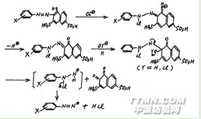 而活性染料中的母體染料很大部份為偶氮結(jié)構(gòu),因此活性染料很易產(chǎn)生遇氯變褪色問題。