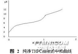 1 中和法分析THPC的原理在THPC水溶液中,THPC會離解成THP、甲醛和氫離子:(HOCH2)4PCl → (HOCH2)4P+ + Cl- (2)(HOCH2)4P+ → (HOCH2)3P + CH2O + H+ (3) 在純凈的THPC溶液中,發(fā)現(xiàn)用NaOH滴定時pH值有突躍變化,突躍范圍是8-10,滴定曲線如圖(2)所示: