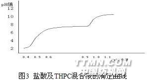 圖3 鹽酸及THPC混合液的滴定曲線 圖(3)中pH值有兩個突躍范圍:pH 1.5-3.5和pH 8-10,由此可分別選用甲基橙和酚酞作指示劑,測出鹽酸濃度及總酸度,最終測算出THPC的濃度。