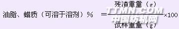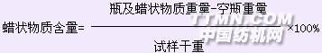 3. 四氯化碳萃取法(1)主要儀器和化學(xué)品 脂肪萃取器、恒溫水浴鍋。四氯化碳(C.P.)(2) 步驟 稱取經(jīng)剪碎并預(yù)先在105℃烘箱中烘至恒重的試樣10g(精確到0.0001g)。將試樣放在特制的紙筒或以濾紙做成的紙筒中,紙筒置于脂肪萃取器中,筒的高度應(yīng)高于萃取器虹吸管的上端1-1.5cm,而試樣在濾紙筒中的高度以低于虹吸管頂端1-1.5cm為宜。在脂肪萃取器的燒瓶中加入120mL四氯化碳,并置于恒溫水浴中,調(diào)節(jié)溫度,保持溶劑每小時虹吸循環(huán)3-4次,萃取3h后冷卻,將萃取器燒瓶中含有蠟狀物質(zhì)的萃取液濾入已知重量的三角瓶中。將萃取器的燒瓶、濾紙及漏斗用溶液洗3次,在水浴上加熱蒸餾。待溶劑全部蒸出后,再將三角瓶置于烘箱中,于105℃溫度烘至恒重,在干燥器中冷卻后精確稱重。(3) 計算