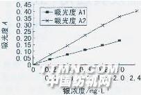 圖1 銀的工作曲線和線性范圍2結(jié)果和討論2.1儀器條件的影響 試驗(yàn)按照儀器供應(yīng)商提供的銀檢測(cè)的最佳靈敏譜線;即328.1 nm作為分析用譜線,并選擇較小的狹縫寬度,以利于分開(kāi)相鄰的譜線,消除譜線干擾。試驗(yàn)選擇狹縫寬度為0.2 nm。 試驗(yàn)發(fā)現(xiàn),燃燒器高度對(duì)銀的吸收影響較小。由此可見(jiàn),火焰中銀原子分布均勻。試驗(yàn)選擇燃燒器高度為7 mm,使火焰的中部通過(guò)光路。研究發(fā)現(xiàn),乙炔流量不影響銀的吸收,乙炔流量為0.9~1.3 mL/min,銀的吸收相當(dāng)穩(wěn)定。因此選擇中溫火焰,取乙炔流量為1.1 mL/min。2.2共存元素的干擾試驗(yàn) 銀是一種不易受干擾的元素,通過(guò)對(duì)鉛、鎘、鉻、鈷、銅、鎳、鋅、砷、汞、鐵等共存元素進(jìn)行干擾試驗(yàn)發(fā)現(xiàn),l 000 μg/mL的上述十種元素均不干擾銀的測(cè)定。2.3特征濃度和檢出限 特征濃度指吸光值為0.004 4時(shí)所對(duì)應(yīng)元素的濃度,試驗(yàn)所用方法測(cè)得銀特征濃度為0.009 8 μg/mL。按照試驗(yàn)方法,測(cè)定銀的試劑空白溶液11次,用3倍的標(biāo)準(zhǔn)偏差除以標(biāo)準(zhǔn)曲線的斜率,即得到本方法的檢出限。本方法的檢出限為0.005斗g/mL。可見(jiàn)火焰原子吸收法測(cè)定銀檢出限較低,完全可以滿(mǎn)足測(cè)試要求。2.4回收率測(cè)定 在樣品中加入銀標(biāo)準(zhǔn)溶液,進(jìn)行回收率測(cè)定(表1)。經(jīng)測(cè)定,回收率在86.3%~101.7%。