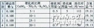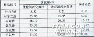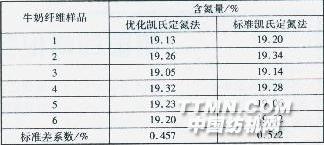 2.2優(yōu)化凱氏定氮法的準(zhǔn)確度分析及評(píng)價(jià) 分別用優(yōu)化凱氏定氮法和標(biāo)準(zhǔn)凱氏定氮法(GB/T5009.5-2003)測(cè)定相同質(zhì)量和批次的牛奶纖維的含氮量,用標(biāo)準(zhǔn)差系數(shù)(CV=σ/μ,又稱(chēng)標(biāo)準(zhǔn)變異系數(shù),反映單位均值上的離散程度,其中σ為標(biāo)準(zhǔn)差,μ為平均數(shù))評(píng)定測(cè)試方法準(zhǔn)確度[4,5],測(cè)試結(jié)果見(jiàn)表3。表3優(yōu)化凱氏定氮法與標(biāo)準(zhǔn)凱氏定氮法的精密度