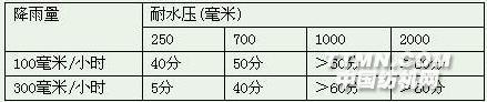 防水透濕潤織物目前尚無統(tǒng)一的測試方法,一般采用似下方法測試和評價透濕、防水和拒水性。 1.透濕性;通過從人體排出的水蒸汽進(jìn)行測定,經(jīng)科學(xué)研究和穿著試驗得出的結(jié)果是,用JISZ 2208測試服料透濕度以達(dá)到4000克/米2?24小時為好。 2.防水性 (1)織物的防水性,用邦迪斯門防水度試驗法的JISL l092C法(DlN 53888)是較合乎運(yùn)動時實際情況的,即在織物里面受強(qiáng)烈揉磨的同時,向底布表面噴射相當(dāng)于大雨時40倍的暴雨來檢驗的試驗方法,具體用降雨量和雨浸透到織物內(nèi)所需要的時間來評定防水性,見表4。表4降雨量和雨浸透到織物內(nèi)所需時間