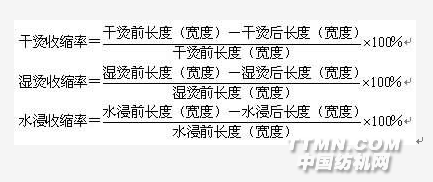 Ⅰ 實驗?zāi)康目椢镌谑艿剿蜐駸岬韧獠恳蛩氐拇碳ず?,纖維從暫時平衡狀態(tài)轉(zhuǎn)到穩(wěn)定的平衡狀態(tài),在這個過程中發(fā)生了伸縮,其伸縮的程度就是伸縮率。通過實驗,測試織物分別受水和濕熱處理前后的尺寸變化,求得不同情況下織物的縮率。掌握織物縮率的測試方法,并了解織物產(chǎn)生收縮的原因。Ⅱ 實驗儀器和試樣實驗儀器:水箱、蒸汽熨斗、鋼尺、縫線、鉛筆等用具。試樣:機織物和針織物各兩塊。Ⅲ 實驗內(nèi)容材料縮率測試包括3個實驗內(nèi)容: 1. 干燙縮率實驗:織物在干燥情況下,用熨斗熨燙,使其受熱后產(chǎn)生收縮,測干燙縮率。 2. 濕燙縮率實驗:指將原料噴灑均勻的水霧,使之受潮后產(chǎn)生的回縮,測試織物濕燙縮率。 3. 水浸縮率實驗:又稱落水實驗,指讓織物完全浸泡在水里,給予充分吸濕而產(chǎn)生收縮,并測試織物的水浸縮率。 Ⅳ 實驗方法與步驟1、干燙縮率實驗:(1)采樣:在布匹的頭部或尾部除去1m以上,并除去布的兩道邊,取長度50cm作 為試樣。(2)根據(jù)不同織物的熨燙溫度條件,在試樣上熨燙15s后,待冷卻。(3)待涼透后,測試試樣長度和寬度,然后計算該織物的收縮率。2、濕燙縮率實驗:濕燙縮率實驗按工藝不同分為噴水熨燙測試法和蓋濕布熨燙測試法兩種。A、噴水熨燙測試法a. 采樣:在布匹的頭部或尾部除去1m以上,并除去布的兩道邊,取長度50cm×寬度50cm作為試樣。 b. 在試樣上用清水噴濕,注意水分分布要均勻,然后用熨斗在試樣上往復(fù)熨 燙,時間控制在熨干為宜,在測試時,溫度條件與干燙測試相同。 c. 待試樣晾干后,測量其長度和寬度,并計算收縮率。B、蓋濕布熨燙測試法a. 采樣:在布匹的頭部或尾部除去1m以上,并除去布的兩道邊,取長度50cm×寬度50cm作為試樣。b. 用一塊去漿的毛白平布清水浸透,并擰干備用。把濕布蓋在試樣上,按照溫度條件,用熨斗在試樣上來回熨燙,時間控制在蓋布熨干。 c. 待試樣晾
