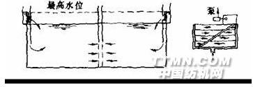 調(diào)節(jié)池的設(shè)計(jì)調(diào)節(jié)池的結(jié)構(gòu)如圖所示。這種形式調(diào)節(jié)池的出水槽是沿池的對(duì)角線方向設(shè)置的。池內(nèi)設(shè)有若干縱向隔板。廢水經(jīng)左右兩側(cè)的水槽進(jìn)入池內(nèi)。由于隔板之間形成的水流通道長度不同,同一時(shí)間進(jìn)入池內(nèi)的廢水,需要停留不同的時(shí)間才能達(dá)到出水槽。反而言之,出水槽內(nèi),同一時(shí)刻的廢水是不同時(shí)刻流入池內(nèi)的,在槽中相遇并混合,實(shí)現(xiàn)水質(zhì)均一。