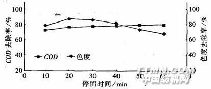 測定項目的分析方法采用《水和廢水標(biāo)準(zhǔn)監(jiān)測分析方法》(第3版)水力停留時間和測試結(jié)果如圖5-1 、圖5-2、表5.2圖5-1:廢水停留時間