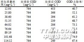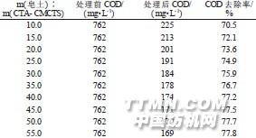 注: 被處理廢水的pH 為5.0, CTA- CMCTS 在廢水中的質(zhì)量濃度為51.35 mg/L。由表5 可看出, 皂土與CTA- CMCTS 復配比的增加會提高混凝劑對印染廢水COD