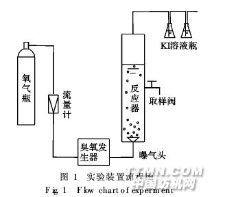 1 實驗部分1.1 試劑與儀器濃硫酸、氫氧化鈉、叔丁醇均為分析純;所用廢 水特征pH 7. 4, COD cr 96. 2 mg/L,UV2541. 020,色 度25倍。KT-OZ-3G臭氧發(fā)生器;雷磁PHS-3C精密pH 計;G10T8 UV燈(10W);紫外可見分光光度計。1.2 實驗方法反應(yīng)器為圓柱形,內(nèi)徑45 mm,高70 cm。以純 氧作氣源,經(jīng)過臭氧發(fā)生器高壓放電后得到臭氧和 氧氣的混合氣體,該混合氣體通過硅膠管進(jìn)入反應(yīng) 器中,由砂芯曝氣頭進(jìn)行布?xì)?。實驗流程見圖1。 除特殊說明外,所有實驗均在下述條件下進(jìn)行, 廢水500 mL,進(jìn)氣流量為30 L/h,臭氧濃度 2. 70 mg/L,反應(yīng)20 min,廢水初始pH值為7. 4,UV 燈為10W。