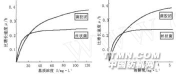 圖1 兩類微生物比增長速率與基質(zhì)濃度/DO的關(guān)系另外,關(guān)于污泥膨脹的理論還有A /V假說、饑餓假說理論和積累—再生假說理論等等。2 污泥膨脹類型活性污泥系統(tǒng)中的微生物處于動(dòng)態(tài)平衡之中,理想的污泥絮體沉降性能良好,絲狀菌和菌膠團(tuán)之間相互競爭,相互依存,絮體中存在的絲狀菌有利于保護(hù)絮體已經(jīng)形成的結(jié)構(gòu)并能增加其強(qiáng)度。但是在污泥膨脹誘因的誘發(fā)下就容易發(fā)生污泥膨脹。污泥膨脹可以分為兩大類:絲狀菌膨脹和非絲狀菌膨脹。前者是由于活性污泥中大量絲狀菌繁殖而造成的,大量的絲狀菌從污泥絮體中伸出很長的菌絲體,菌絲體之間互相接觸,起到架橋作用,從而形成了一個(gè)框架結(jié)構(gòu),支撐著污泥絮體,阻止了絮體的有效沉降。后者是由于菌膠團(tuán)在特定的環(huán)境條件下分泌并積累大量高粘性物質(zhì),而高粘性物質(zhì)的結(jié)合水高達(dá)380%,從而造成污泥比重減輕,壓縮性能惡化而引起膨脹。