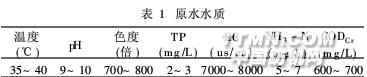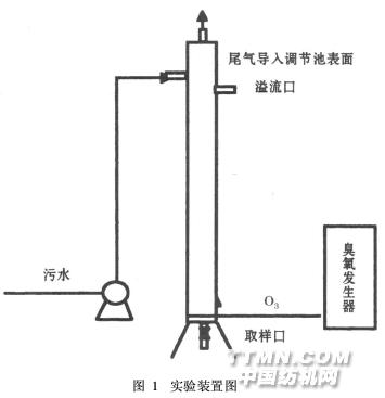 2 實(shí)驗(yàn)裝置及材料2·1 實(shí)驗(yàn)裝置及方法研究使用青島國林公司提供的氧氣源CF-G -2-100g臭氧發(fā)生器1臺,氧化塔(Φ360mm× 5m) 1套,臭氧采用底部微孔曝氣的方式進(jìn)行投 加,曝氣裝置為鈦合金材質(zhì)的曝氣管2支(Φ20× 200mm)。3t/h提升泵1臺,流量可調(diào)。臭氧發(fā)生 器產(chǎn)生臭氧以后通過反應(yīng)塔底部微孔曝氣管進(jìn)入, 在臭氧進(jìn)入反應(yīng)塔的同時(shí)印染廢水從塔上部的進(jìn)水 口進(jìn)入。在反應(yīng)塔底部設(shè)取樣口,分別于0、10、 20、30、45、60、80、100、120min取樣約500ml 進(jìn)行各項(xiàng)水質(zhì)化驗(yàn)。CODCr檢測采用重鉻酸鉀法, 色度檢測采用稀釋倍數(shù)法,臭氧濃度標(biāo)定采用碘量法。