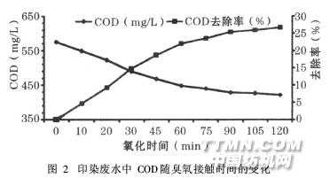 由圖2可知,隨臭氧接觸時(shí)間的增加,廢水中 CODCr含量呈不斷減少的趨勢變化,變化幅度從 575·3mg/L下降到413·15mg/L,去除率達(dá)到了 30%。這是由于臭氧的強(qiáng)氧化性將部分有機(jī)物氧化 為H2O和CO2。從圖中還可以看出,在臭氧接觸 45min內(nèi)CODCr去除速率為0·5mg/L·min;且在 30~45min有個(gè)躍點(diǎn), 15min內(nèi)去除率從15%增加 到了24%;從45~120min,接觸時(shí)間延長了近3 倍,而CODCr去除速率僅從24%增加到29%,增 加了5%。由此說明臭氧對CODCr的去除率并不與 臭氧接觸時(shí)間成正比,即臭氧接觸時(shí)間在一定范圍 內(nèi)(30~45min)對CODCr的處理較為經(jīng)濟(jì)合理。