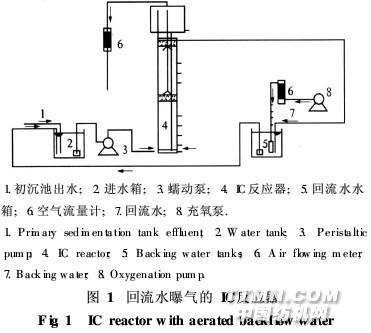 1 材料與方法1. 1 原水水質(zhì)污水取自鄭州市某制染有限公司退漿工序產(chǎn) 生的廢水,其中含有漿料分解物、纖維屑、酶等.該 污水水量較少,但污染嚴(yán)重,是漂染污水中有機(jī)污 染物的主要來(lái)源,上漿過(guò)程產(chǎn)生以聚乙烯醇 (PVA)為主的退漿廢水,廢水可生化性較差.取樣 測(cè)得印染廢水水質(zhì)COD為3 825. 4 mg·L-1;BOD 為688. 6 mg·L-1;懸浮固體(SS)為405. 3 mg· L-1; pH值為11. 34.生活污水水質(zhì)COD為 207. 6 mg·L-1; BOD為95. 5 mg·L-1; SS為 307. 4 mg·L-1; pH值為7. 66.1. 2 試驗(yàn)裝置回流水曝氣的IC反應(yīng)器見(jiàn)圖1.