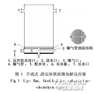 1 實驗部分1. 1 試劑與儀器試劑有:活性炭、濃硫酸、氫氧化鈉、硫酸銀、重 鉻酸鉀、七水合硫酸亞鐵、氫氧化鈣,以上試劑均為 AR;實驗所用廢水為蘇州吳江市新達印染廠A/O 二級生物處理出水。設(shè)備為YP1201N型的電子天平; PHB-8型 pH計;CONCEPTc型磁力泵;可調(diào)萬用電爐;鐵炭 微電解反應器(自制)。試驗用原水: pH: 6. 5、色 度: 30倍、CODCr: 100-150 mg/L。1. 2 實驗裝置小試實驗的主體裝置為固定床鐵炭微電解反 應器,有效容積5 L,高徑比為2∶1,采用升流式進 水,底部配有布水板及穿孔曝氣管,如圖1所示,有 利于氣水的均勻混合。