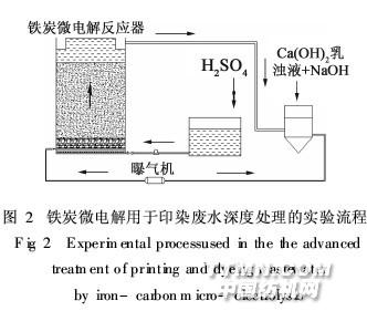 1. 3 實驗方法鐵屑采用5%熱NaOH溶液堿洗10 min,除掉 鐵屑表面的油污后,用10%的稀H2SO4浸泡 10 min,除掉表面的金屬氧化物,最后用自來水沖 洗干凈;活性炭用原水充分浸泡72 h,使之吸附接 近飽和,消除吸附對電解實驗的影響。將鐵炭按照 一定的體積比混合后,裝入反應器。試驗工藝流程 如圖2所示。