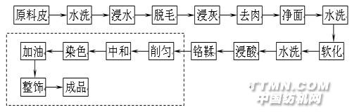 一、廢水產(chǎn)生過程 皮革加工是以動物皮為原料,經(jīng)化學(xué)處理和機(jī)械加工而完成的,其生產(chǎn)基本工藝如圖所示: