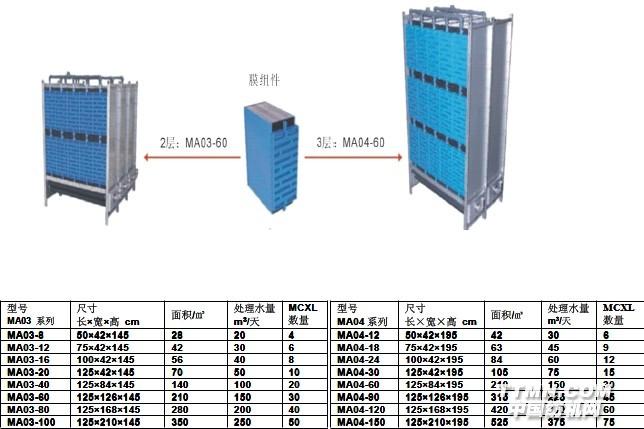 MicroClear®超濾膜組件可以有非常多的組合方式,既可以并排也可以重疊地堆放。MA03系列組件(膜元件的兩層堆放)是為較淺的反應(yīng)池設(shè)計(jì)的(水深1.8米),例如集裝箱反應(yīng)池。如果反應(yīng)池比較深(水深超過(guò) 2.3米)最適合采用MA04系列。膜元件三層堆放,優(yōu)點(diǎn)是所需空間小,曝氣更有效率。