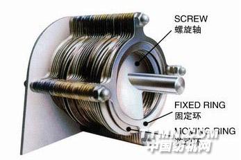 脫水機(jī)的疊螺主體是由固定環(huán)和游動環(huán)相互層疊,螺旋軸貫穿其中形成的過濾裝置。前段為濃縮部,后段為脫水部。固定環(huán)和游動環(huán)之間形成的濾縫以及螺旋軸的螺距從濃縮部到脫水部逐漸變小。螺旋軸的旋轉(zhuǎn)在推動污泥從濃縮部輸送到脫水部的同時,也不斷帶動游動環(huán)清掃濾縫,防止堵塞。