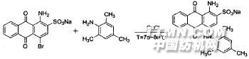 1 反應(yīng)原理c.I.酸性藍(lán)129是由溴氨酸和均三甲苯胺,在催化劑的作用下進(jìn)行芳氨化反應(yīng)制備的,本工藝采用溴氨酸和過量均三甲苯胺反應(yīng),以水/溶劑為介質(zhì),在堿性條件下,用CuCl作催化劑,反應(yīng)生成C.I.酸性藍(lán)129染料,其反應(yīng)歷程如下: