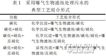 1 曝氣生物濾池工藝曝氣生物濾池(Biological Aerated Filter, BAF)是一種新型高負荷淹沒式三相反應器, 它兼有活性污泥法和生物膜法兩者優(yōu)點。將單個曝氣生物濾池看作是一種處理工藝單元,因此按濾池功能可劃分為單純的除碳濾池、除碳/硝化濾池、除碳/硝化/反硝化濾池等。由此可根據(jù)該工藝的運行特性、處理領(lǐng)域的不同, 采取適當?shù)慕M合形式, 完成碳化、硝化、反硝化、除磷等工作。目前, 曝氣生物濾池已經(jīng)從單一工藝逐漸發(fā)展成為系列綜合工藝。曝氣生物濾池已被廣泛地應用于城市污水, 小區(qū)生活污水, 生活雜排水和食品加工廢水, 釀造、造紙等高濃度廢水處理。表1是采用曝氣生物濾池處理污水的典型流程。