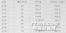 2. 試驗(yàn)方法: 采用查韋清水生化加速和絮聚的方法。 原有污水CODcr=470.5mg/l,分取9升印染廢水放入兩個(gè)曝氣容器中,加酸調(diào)節(jié)PH值至中性,試樣一加入生化加速技術(shù)培養(yǎng)的活性污泥1升和生化加速劑。試樣二加入廠內(nèi)污水處理系統(tǒng)的活性污泥1升,開始曝氣。曝氣相同時(shí)間后,調(diào)節(jié)不同PH值,加入高效絮聚劑P30絮聚后測(cè)定出水COD值。
