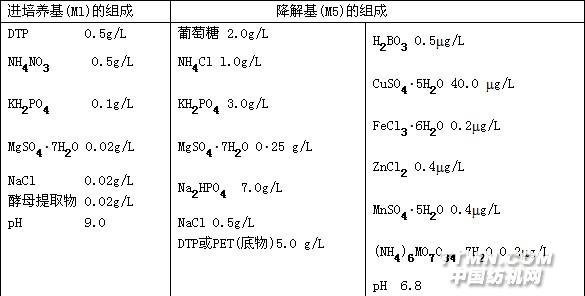 1 實(shí)驗(yàn)1·1菌源 活性污泥分別取自天津石化總公司化纖廠、浙江省紹興銀橋化纖廠、浙江紹興稽山印染廠、福建省福清市化纖廠的廢水池。1·2培養(yǎng)基及降解基條件 培養(yǎng)基(后簡(jiǎn)稱Ml)和降解基(后簡(jiǎn)稱M5)的組成如表1所示。其培養(yǎng)方法為:將污泥溶于生理鹽水,吸取1 mL菌懸液加到5mL的Ml培養(yǎng)基中,30℃培養(yǎng)7d,轉(zhuǎn)接兩次后,作為降解基的微生物來源。降解方法為從MI培養(yǎng)基中移取0.2mL菌液接種至2mL的M5降解基中,于30℃下降解14d。降解后,在降解液中加入4.67mL甲醇,使得降解液的甲醇濃度為70%,隨后用70%的甲醇定溶至2