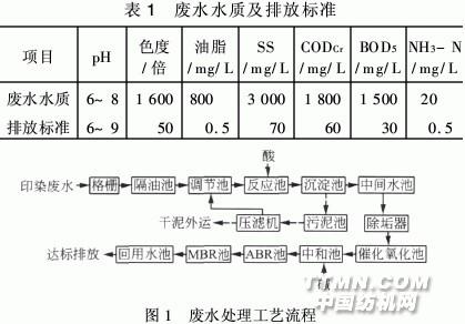 1 工程概況 廣東省某印染廠排放的生產(chǎn)廢水主要污染物為 染料、漿料、助劑、油劑、酸堿、纖維雜質(zhì)、砂類物質(zhì)、無 機鹽等,具有污染物濃度高、成分復(fù)雜、水質(zhì)多變、色 度高、毒性大、難生化降解的特點,屬難處理的工業(yè)廢 水,直接排放會對環(huán)境造成嚴(yán)重污染。該生產(chǎn)廢水量 為1 000 m3/d,設(shè)計最大處理能力為1 200 m3/d。出 水執(zhí)行《污水綜合排放標(biāo)準(zhǔn)》(GB 8978—1996 )一級 標(biāo)準(zhǔn),廢水處理后回用于車間設(shè)備清洗、綠化、地面沖 洗等,具體廢水水質(zhì)及排放標(biāo)準(zhǔn)見表1。經(jīng)過分析 此廢水的特點和對比處理試驗效果,從處理效果 和處理成本等綜合考慮,決定采用酸解沉淀—催化氧化—ABR—MBR工藝(見圖1)。