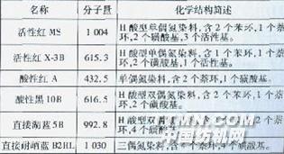 0 前言 水溶性偶氮染料是重要的纖維用染料,主要包括活性染料、酸性染料和直接染料等,具有種類繁多、色譜齊全、易于使用的特點,同時也被認(rèn)為是印染廢水的主要污染物之一,具有較高的生物毒性。對于印染廢水的脫色處理,還原法具有脫色劑用量少、反應(yīng)速度快和脫色率高等優(yōu)點,十分適用于含有水溶性染料的染色廢水的快速脫色。在水溶性陰離子偶氮染料還原脫色處理方面,近年來的研究發(fā)展較快,盡管有一些研究涉及偶氮染料的還原脫色反應(yīng),但是關(guān)于偶氮染料光還原脫色降解,特別是在輻射光影響方面鮮見報道。本試驗以硼氫化物和硫酸鹽混合物為還原脫色劑,對17個水溶性陰離子偶氮染料進行了脫色反應(yīng),重點考察了汞燈光輻射對其還原脫色反應(yīng)的影響,并運用紫外可見光譜法對其進行分析。1 試驗1.1染料與試劑 本研究共使用17個國產(chǎn)水溶性偶氮染料,其中活性染料包括活性紅MS、活性紅X-3B、活性紅K2G、活性嫩黃X-7G和活性藍B;酸性和中性染料包括酸性紅A、酸性黑10B、酸性橙156、酸性媒介黑PV和中性黑172;直接染料包括直接桃紅12B、直接湖藍5B、直接耐曬藍B2RL、直接深棕M、直接灰D、直接黃棕D-3G和直接棗紅GB?;钚约tMS、活性紅x-3B、酸性紅A、酸性黑10B、直接湖藍5B和直接耐曬藍B2RL的名稱和化學(xué)結(jié)構(gòu)特征如表1所示;硼氫化鈉、重亞硫酸鈉等試劑均為分析純。 表1偶氮染料的名稱和化學(xué)結(jié)構(gòu)特征