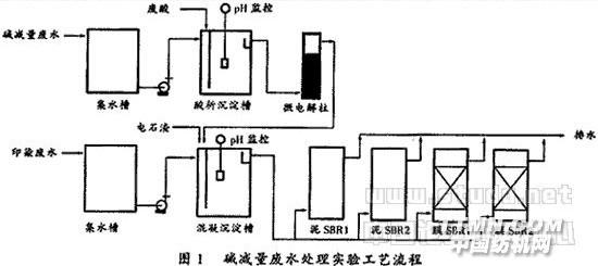 化纖印染廠生產(chǎn)排放印花染色廢水和堿減量生產(chǎn)廢水。滌綸仿真絲纖維在高溫、高堿度條件下被減量,PTA溶入堿液中。堿減量廢水中CODcr和堿含量極高,給廢水處理增加難度[1][2]。本文提出一種應(yīng)用工業(yè)廢料的堿減量廢水處理新技術(shù),實(shí)驗(yàn)研究表明有效、可靠、廉價,適合印染堿減量廢水處理。1 實(shí)驗(yàn)工藝實(shí)驗(yàn)工藝流程如圖1所示。
