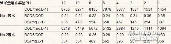 取鑄鐵屑,用5%鹽酸浸泡清洗,加1%JHH活化劑溶液浸泡6h后,裝入微電解柱待用。SBR槽各投加活性污泥2L,其中2槽懸掛30%軟性填料,污泥馴化2周,周期COD去除率約80%~85%,待用。2 靜態(tài)實(shí)驗(yàn)結(jié)果和討論2.1 酸析靜態(tài)試驗(yàn) 水質(zhì):堿減量廢水,No.1:NaOH 2.4%,COD 8854mg/L,BOD5 1845mg/L, SS 350 mg/L;No.2:pH 14,COD 6524 mg/L,BOD5 1283 mg/L, SS 136mg/L。表1 堿減量廢水酸析點(diǎn)對COD 和 BOD5/COD的影響