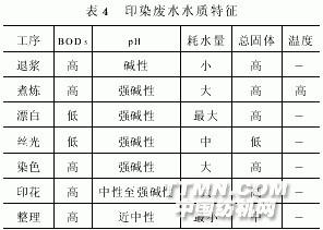 2.4 整理廢水 整理廢水通常含有纖維屑、各種樹(shù)脂、甲醛和漿料等,雖然其COD值較高,但它的廢水量很小,對(duì)整個(gè)廢水的水質(zhì)影響不大。印染加工各道工序水質(zhì)特征如表4。