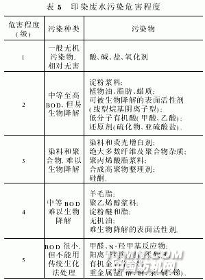 3 危害 由于印染工業(yè)涉及到許多有害化學(xué)藥品,這類(lèi)廢水有機(jī)物含量高、色度深、成分雜、有害物質(zhì)含量高、對(duì)水體會(huì)造成嚴(yán)重危害,紡織印染廢水對(duì)環(huán)境和人類(lèi)的危害引起了越來(lái)越多的人的關(guān)注。紡織印染廢水中主要污染物根據(jù)危害程度可分為1~5級(jí),1級(jí)最輕微,5級(jí)最嚴(yán)重,具體如表5。