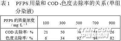 印染行業(yè)是紡織系統(tǒng)的主要行業(yè),幾乎所有織物都需要印染作為最后一道工序。印染行業(yè)排出的廢水,全國每天約為300~400萬t,是工業(yè)廢水產(chǎn)生的大戶。目前,由于技術(shù)等原因,絕大多數(shù)印染廠所排出的廢水尚未進行處理,其主要污染物為COD、BOD、色度和酸堿度等。這些污染物,其含量均大大超過國家排放標(biāo)準(zhǔn),對水環(huán)境與城市的環(huán)境帶來了嚴(yán)重后果,必須進行處理。 活性染料是在纖維素纖維及其混紡織物染色中使用最廣泛的一類染料,但由于其在染色過程中易產(chǎn)生水解染料,固色率不高,因而所產(chǎn)生的廢水成分復(fù)雜,色度深,有機物含量高。目前還沒有特別有效的方法處理活性染料廢水。 在工業(yè)廢水和生活污水的處理中,應(yīng)用最廣泛、成本最低廉、最常采用的處理方法仍然是絮凝—沉淀法〔1〕。該法的關(guān)鍵是尋找一種高效的絮凝劑。 本文即是利用新型的絮凝劑聚磷硫酸鐵(PFPS)對活性染料廢水進行處理,通過大量實驗,找出了達(dá)到最佳COD和色度去除率的PFPS用量和適合的pH范圍,并與常規(guī)絮凝劑聚合硫酸鐵(PFS)進行了對比,證明PFPS具有優(yōu)良的性能。1 實驗部分1.1 測試方法 水質(zhì)化學(xué)需氧量(COD)———按國際GB11914-1989重鉻酸鹽法測定〔3〕;水質(zhì)色度的測定———按國標(biāo)GB11903-1989稀釋倍數(shù)法測定〔4〕。1.2 實驗儀器及藥品 回流裝置,25mL(或50mL)酸式滴定管、具塞比色管等。 硫酸銀、硫酸汞、硫酸、活性嫩黃K-4G、活性艷紅M-8R、活性翠蘭KN-G等,均為市售。2 實驗結(jié)果與討論2.1 PFPS用量對處理效果的影響 在質(zhì)量濃度為200mg/L的單組分活性嫩黃K-4G染料廢水中分別加入100~900mg/L各種用量的PFPS,攪勻后靜止15min,吸取一定溶液進行COD和色度試驗,結(jié)果見表1。 從表1可看出,當(dāng)P