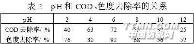當(dāng)配位的水分子被氫氧根所取代時,便發(fā)生水解作用,產(chǎn)生帶正電荷、負(fù)電荷和電中性的含鐵的分子和離子,起到絮凝作用。隨著PFPS用量的增加,這種水解作用加強,產(chǎn)生的含鐵絡(luò)合離子增加,到500mg/L時,其濃度達(dá)到最大值,絮凝效果也最好;PF2PS用量再增加時,每個鐵離子周圍的配位水分子反而會減少,水解作用減弱,表現(xiàn)為PFPS的絮凝作用減弱,COD及色度的去除率下降。因此,在此實驗條件下,PFPS的用量選擇為500mg/L。2.2 pH值對PFPS處理效果的影響 根據(jù)絮凝化學(xué)理論,絮凝劑水解產(chǎn)生絡(luò)合離子的反應(yīng)是與pH有關(guān)的,也就是說,絮凝劑的絮凝效果與pH有關(guān)。為了了解pH對PFPS處理單組分活性染料廢水絮凝效果的影響,本文在若干100mL質(zhì)量濃度為200mg/L的活性嫩黃K-4G染液中,分別用硫酸、碳酸鈉調(diào)節(jié)pH為2~12,然后,加入PFPS500mg/L,攪勻,靜置15min進行實驗,結(jié)果如表2所示。