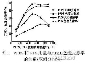由表2可知,在pH6時,COD和色度去除率均達(dá)到最佳值,即PFPS絮凝劑使用的pH最佳范圍是5~6.5。2.3 PFPS和PFS用量對處理雙組分活性染料廢水的影響 在染色過程中,很多顏色需要兩種或兩種以上的染料拼混而得到。因此,染色廢水中常常存在兩種或兩種以上的染料。以下實驗是分別用不同濃度的PFPS和PFS處理質(zhì)量濃度為200mg/L的活性艷紅M-8R和活性翠蘭KN-G混合染液廢水,其結(jié)果如圖1所示。 從圖1可以看出,PFPS和PFS達(dá)到其最佳絮凝效果的質(zhì)量濃度分別為500mg/L和700mg/L,而且從COD和色度的去除率來看,PFPS的絮凝效果優(yōu)于PFS。