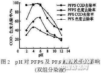 從圖2可以看出,對雙組分活性染料染液,PF2PS和PFS絮凝劑有良好絮凝效果的pH范圍均為4.5~6,即在弱酸性范圍。隨著pH的增加,它們的絮凝效果逐漸減弱。3 結(jié)論 (1)對于質(zhì)量濃度為200mg/L的單組分活性染料廢水,PFPS的最佳用量為500mg/L,pH選擇在5~6.5。此時,COD去除率為70%以上,色度去除率在90%左右。 (2)對于質(zhì)量濃度分別為200mg/L的雙組分活性染料廢水,PFPS和PFS的最佳用量分別為500mg/L和900mg/L,pH選擇在4.5~6。此時,PF2PS對COD的去除率為70%左右,色度去除率在90%以上;PFS對COD的去除率為40%左右,色度去除率在90%以上。 (3)通過以上實驗,證明PFPS是比PFS效果更好的活性染料廢水處理絮凝劑。