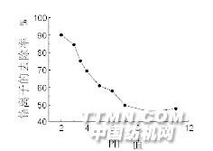 圖5 不同pH條件對(duì)Cr(VI)去除率的影響Fig.5AdsorptionofCr(VI)inaqueoussolutionOnCNTsatvariouspHvalues pH值對(duì)鉻Cr(VI)去除率的影響(如圖5)。研究0.15g改性碳納米管對(duì)25mL50mg·L-1的不同pH值的鉻Cr(VI)溶液的吸附行為,分別用H2SO4和NaOH溶液調(diào)節(jié)溶液的pH值。結(jié)果表明,溶液pH值在2~7之間, 改性碳納米管對(duì)鉻Cr(VI)的去除率隨pH值的增大而迅速減小,當(dāng)pH值為2時(shí),去除率為91% ,當(dāng)pH值升高到7時(shí),吸附率迅速降為49%,這表明酸性條件對(duì)吸附有利;當(dāng)溶液pH值7~11之間,改性碳納米管對(duì)鉻Cr(VI) 的去除率隨pH值的變化不大。 通常,鉻(Cr)的化合物有三價(jià)和六價(jià)兩種價(jià)態(tài)。在水體中,Cr(VI)一般以CrO42-、HCrO4-和Cr2O72-三種陰離子形式存在,受水體中pH 值、有機(jī)物、氧化還原物質(zhì)、溫度及硬度等條件影響,Cr(VI)的化合物形態(tài)按下列方式可以相互轉(zhuǎn)化[21]: 2CrO42-+2H+←→(2HCrO4-)←→Cr2O72-+H2O 混酸處理的碳納米管表面會(huì)引入羥基、羧基、羰基等官能團(tuán)[19]。在酸性條件下,這些官能團(tuán)與氫離子發(fā)生作用,使碳納米管的表面帶上正電荷。在堿性條件下,羧基和氫氧根離子作用,使碳納米管表面帶上負(fù)電荷[19]。 在酸性條件下,鉻Cr(VI)主要以HCrO4-陰離子形式存在[21],而此時(shí)改性碳納米管的表面帶正電荷,異性電荷相互吸引作用,有利于吸附,且酸度越強(qiáng),吸附就越好。在堿性條件下,鉻Cr(VI)主要以CrO42-陰離子形式存在[21],而碳納米管表面此時(shí)帶有負(fù)電荷,同性電荷相互排斥作用,不利于吸附。此外,在高pH 值下,改性碳納米管表