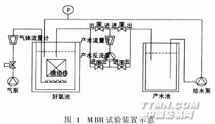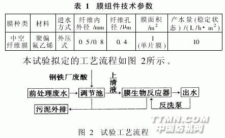 常州市某印染廠的前處理車間,主要從事各種全棉和棉彈類梭織面料的前處理加工,包括煮練、燒毛、冷堆、漂白和絲光等工序,其中煮練、漂白和絲光工序會產(chǎn)生大量廢水。該車間產(chǎn)生廢水約150~400t/d,廢水水質(zhì)組分復(fù)雜,波動大,可生化性差,處理較困難。目前工廠對該車間廢水的處理措施為:與染色廢水混合→投加PAC(聚合氯化鋁,含Al2O39%)1.5‰(體積比),進(jìn)行混凝處理→以鋼鐵廠廢酸調(diào)節(jié)pH值→進(jìn)入生化池生化處理。但是,處理效果并不是很好,且因生化池進(jìn)水COD值不穩(wěn)定,直接導(dǎo)致最終出水COD值在100mg/L左右波動,難以達(dá)到一級排放標(biāo)準(zhǔn)。針對印染前處理廢水水質(zhì),先用鋼鐵廠廢酸進(jìn)行簡單預(yù)處理,再采用膜生物反應(yīng)器(MBR)進(jìn)行深度處理,以期使前處理廢水在與其它工序廢水混合之前,將其中的污染物質(zhì)即得以大幅去除,降低后續(xù)處理工序的污染負(fù)荷。1 試驗(yàn)1.1 試驗(yàn)裝置與工藝流程試驗(yàn)裝置如圖1所示。