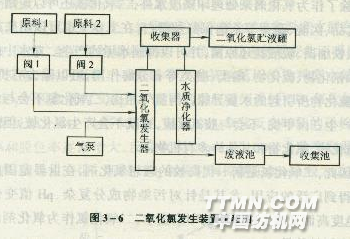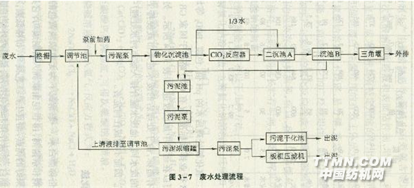 江蘇天倫染織實業(yè)公司將混凝和二氧化氯氧化聯(lián)合運用于處理該公司的生產(chǎn)廢水,廢水處理流程見圖3—7。