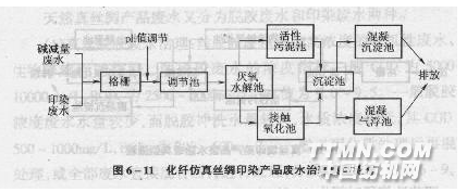 化纖仿真絲綢產(chǎn)品加工過程中產(chǎn)生堿減量廢水和印染廢水,其中堿減量廢水是難降解的高濃度有機廢水。堿減量工藝又分為間隙式和連續(xù)式兩種。間隙式工藝可以回收大部分堿液,再用于生產(chǎn),并將滌綸織物水解下來的對苯二甲酸通過壓濾形式形成泥餅而去除(對苯二甲酸可回收作填充劑、黏合劑等)。連續(xù)式堿減量工藝可通過多次減量形式并適當(dāng)補充堿液后,定期排放殘液。 堿減量廢水一般采用降溫和加酸中和的辦法降低其pH值,再與其他廢水混合處理。當(dāng)堿減量廢水水量較小時,也可與印染廢水混合在一起進(jìn)行統(tǒng)一處理,見圖6一11。