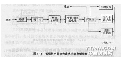毛紡產(chǎn)品分為毛粗紡產(chǎn)品(毛呢、毛毯等厚型織物)、毛精紡產(chǎn)品(毛料等薄型織物)和絨線產(chǎn)品。 毛紡織產(chǎn)品廢水主要指毛粗紡產(chǎn)品、毛精紡產(chǎn)品和絨線產(chǎn)品在染色過程中產(chǎn)生的各種廢水的總稱,它包括染色殘液、漂洗水、洗呢水、縮絨水等。其中染色殘液和初次漂洗水中含有部分剩余染料及大部分或全部染色助劑,而其余各類廢水含污染物濃度較低。 毛紡織產(chǎn)品生產(chǎn)加工過程中主要污染源是染色。純毛產(chǎn)品染色過程中排放的染色廢水一般呈中性或弱酸性,毛紡染色混合廢水基本呈中性。 純毛產(chǎn)品染色廢水BODs/COD~<0.4,屬于易生物降解的廢水,而純毛與毛混紡產(chǎn)品并存的染色廢水BODs/COD~<0.3,屬于較易生物降解的廢水。因此,毛紡織廠產(chǎn)品的染色廢水總體上屬于可生物降解性較好的有機(jī)性廢水。此外,毛紡織產(chǎn)品所用的染料均為水溶性染料,在染液中呈離子狀態(tài),羊毛又是蛋白質(zhì)纖維,上染率高,殘液中染料含量較低,也易于被外加相反電荷的離子所中和,較易于脫色。 3.毛粗紡產(chǎn)品染色廢水治理 典型流程見圖6—6。